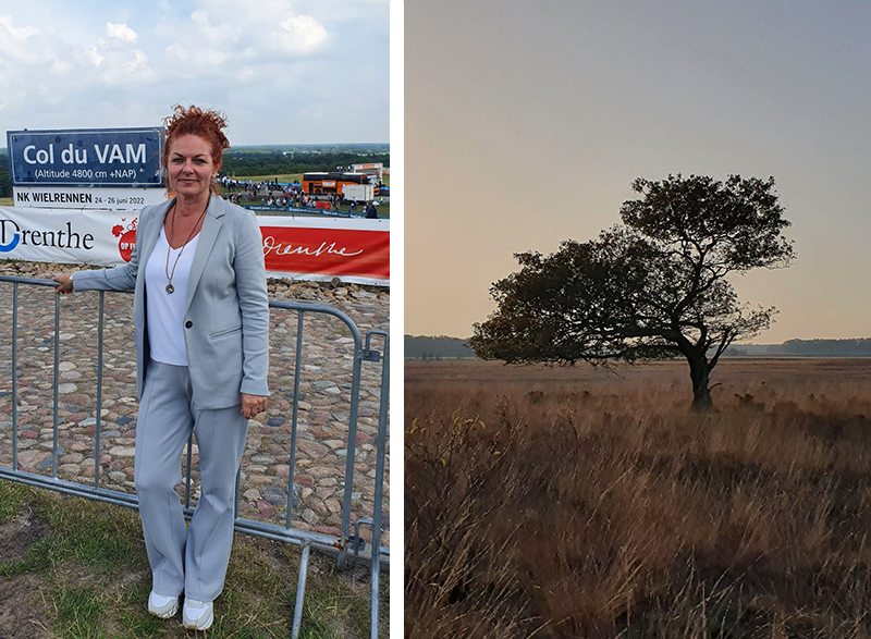 Ik mag dan wel niet van fietsen houden, wandelen vind ik des te leuker. En het liefst op plekken waar je niemand tegen komt. En dat kan gelukkig nog in Drenthe. Ik hou vooral van weidse uitzichten, een bos is aan mij minder besteed. Mijn mooiste ervaring had ik op een zaterdagmiddag in november net voor zonsondergang op het Mantingerveld. De kleuren, de stilte, ik waande me op de savanne in Afrika, alleen de olifanten en giraffen ontbraken.